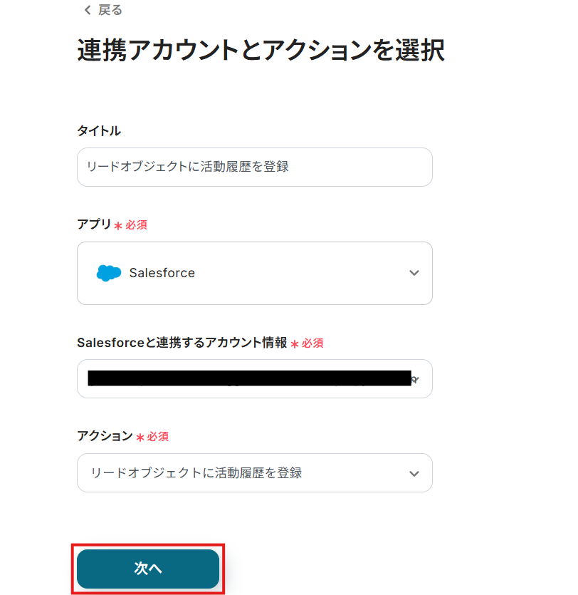 連携するアカウント情報には、ステップ1で連携したアカウント情報が反映されています。トリガーアクションはそのままにして、「次へ」をクリックしてください。