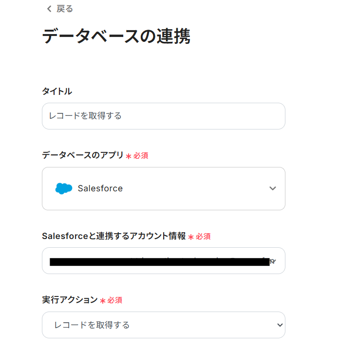 「Salesforceと連携するアカウント情報」を確認し、「実行アクション」はそのままで、データベースの連携の各項目を設定していきます。