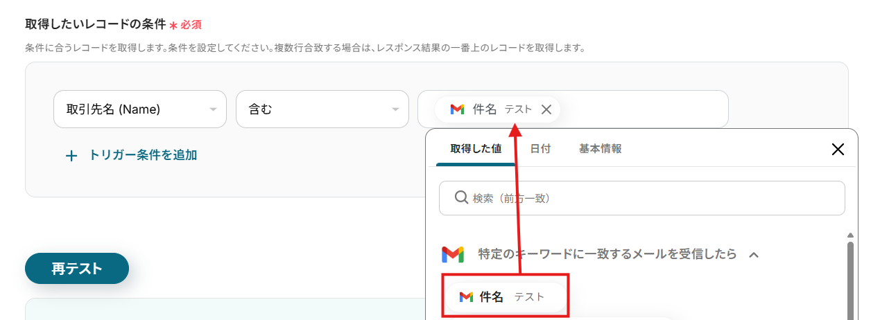 「取得したいレコードの条件」の各項目は、入力欄をクリックして表示される取得した値から選択してください。