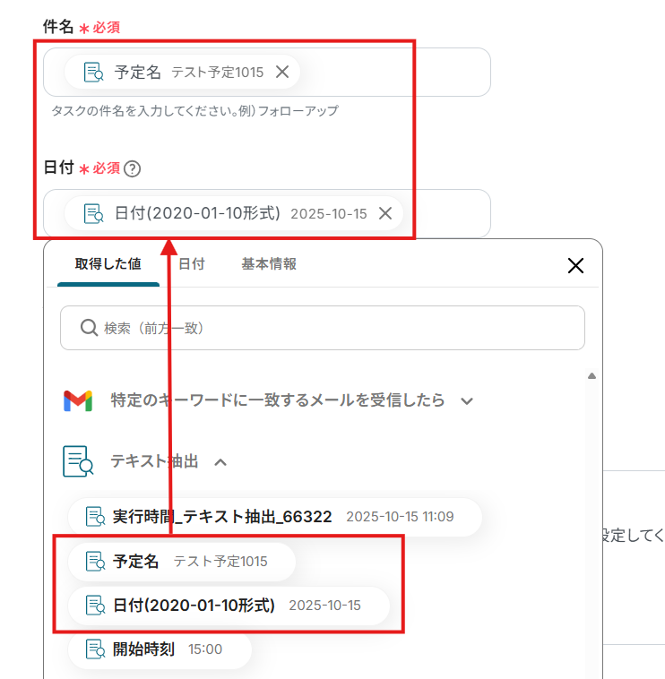 「件名」「日付」は、入力欄をクリックして表示される取得した値(テキスト抽出)から選択してください。