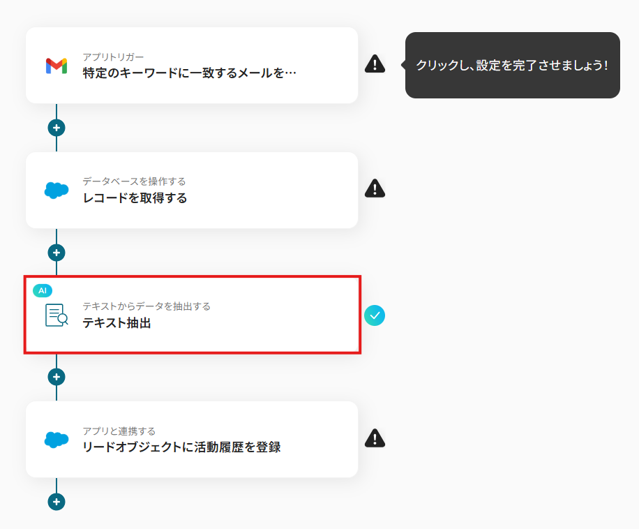 ここで抽出したテキストデータを用いて、Salesforceにデータを追加するため、Salesforceに追加したい項目を全て設定するようにしましょう。