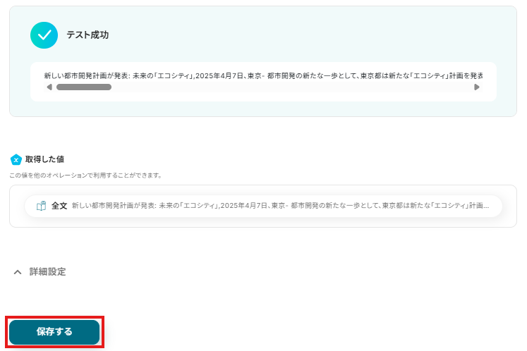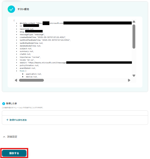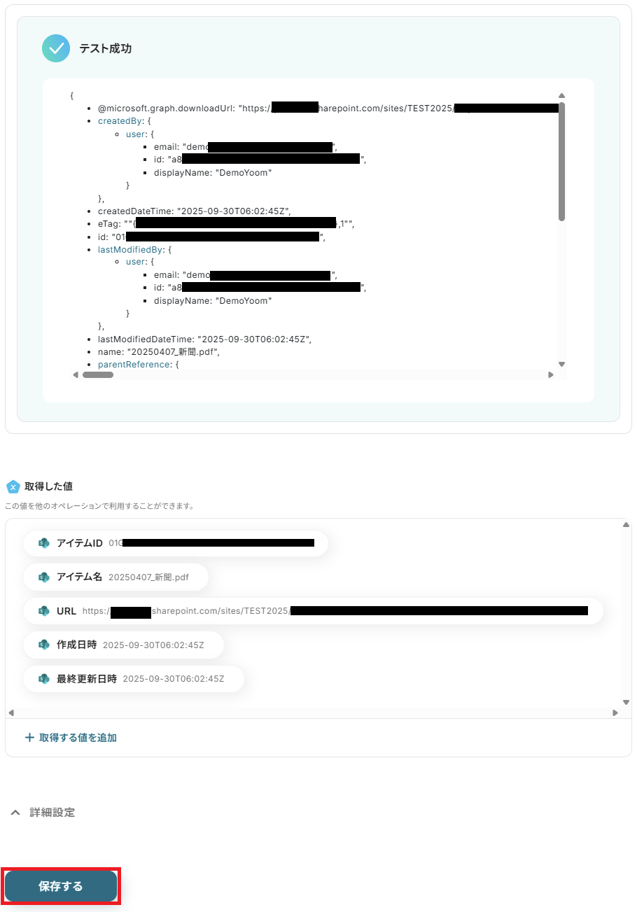 テストが成功すると、Microsoft SharePointに保管したファイル情報が取得されるので、確認したら保存してください。