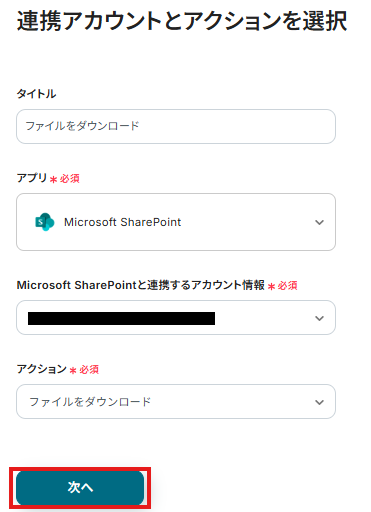 タイトルは、そのままで問題ありませんが、必要であれば変更してください。 アカウント情報を確認します。 アクションが「ファイルをダウンロード」になっていることを確認して「次へ」をクリックします。