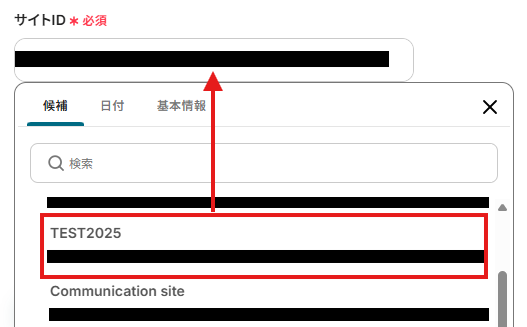 サイトID:候補からMicrosoft SharePointで使用するサイトを選択します