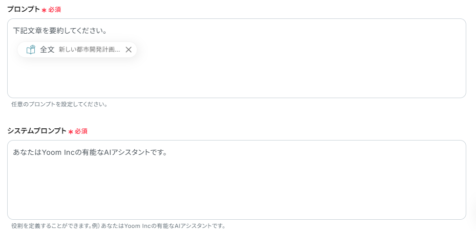 Geminiの「コンテンツを生成(ファイルを利用)」アクションでは、どのような情報を画像から抽出したいか、プロンプトを自由にカスタマイズして設定することが可能です。 Chatworkの「メッセージを送る」アクションでは、通知先のルームIDを任意で設定できるほか、メッセージ内容に固定のテキストを追加したり、Geminiの解析結果などの動的な値を埋め込んだりすることができます。 ■注意事項