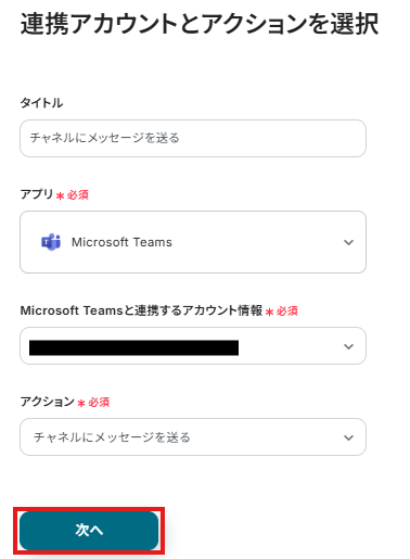 タイトルは、そのままで問題ありませんが、必要であれば変更してください。 アカウント情報を確認します。 トリガーアクションが「サイト内の指定フォルダにファイルが作成または更新されたら」になっていることを確認して「次へ」をクリックします。