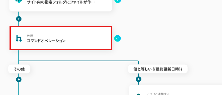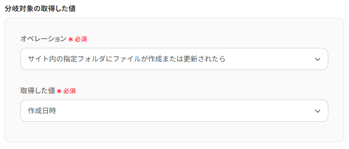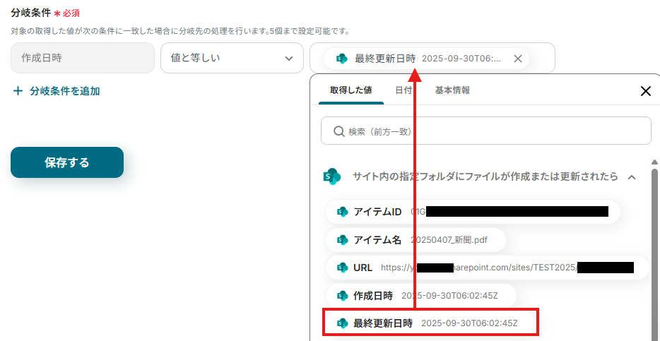 分岐条件:「作成日時」が「等しい」「最終更新日時」となるように入力していきます 「サイト内の指定フォルダにファイルが作成または更新されたら」のプルダウンを開いて、「最終更新日時」を選択します。