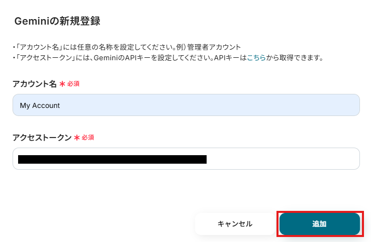アカウント名を任意で設定します。 アクセストークンには、注意書きを読みながら、APIキーを入力します。 入力が完了したら、「追加」をクリックします。