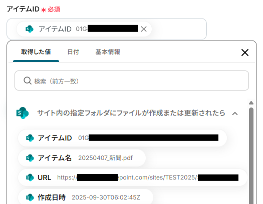 アイテムID:「サイト内の指定フォルダにファイルが作成または更新されたら」のプルダウンを開いて、アイテムIDを選択します