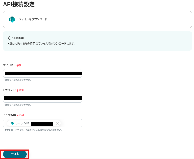 ステップ5:Microsoft SharePointの「ファイルをダウンロード」を設定