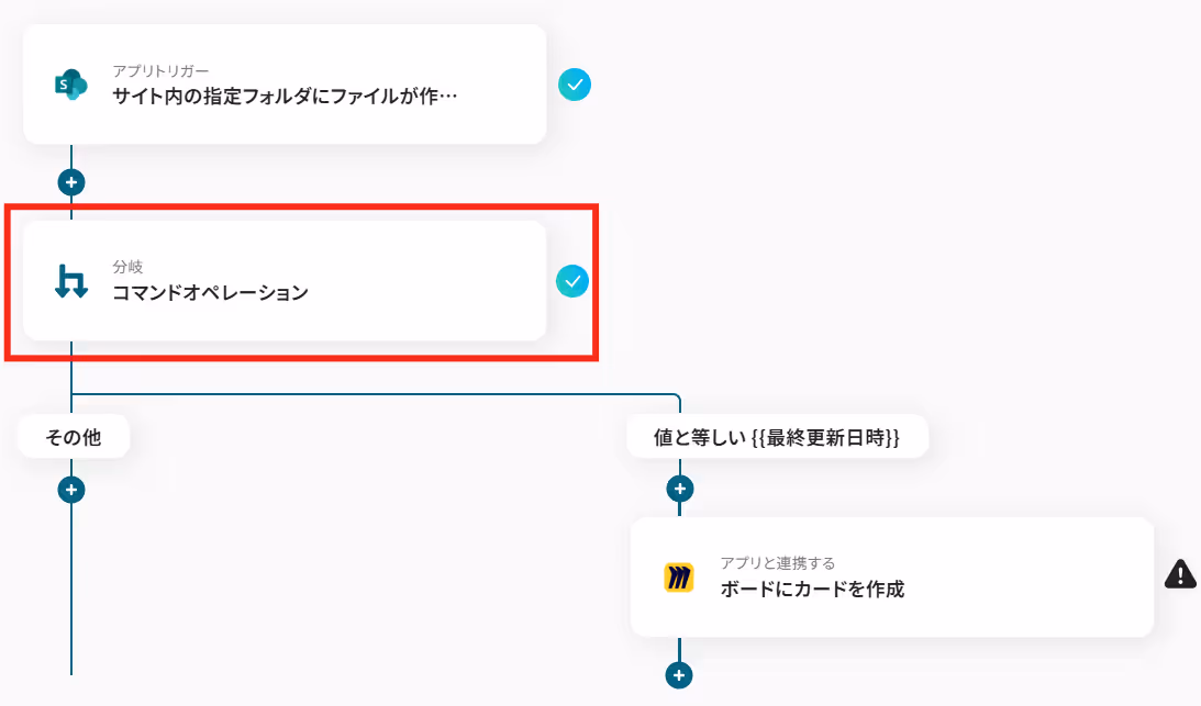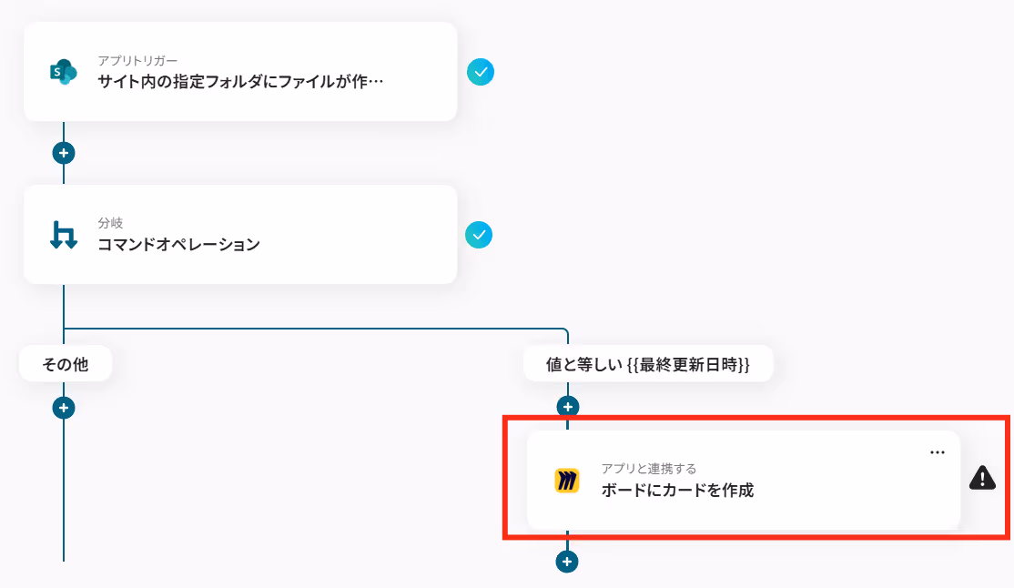 今回はMicrosoft SharePointでファイルが作成されたときだけMiroに連携したいので、「分岐条件」が「作成日時」と「最終更新日時」が等しいときに設定されています。