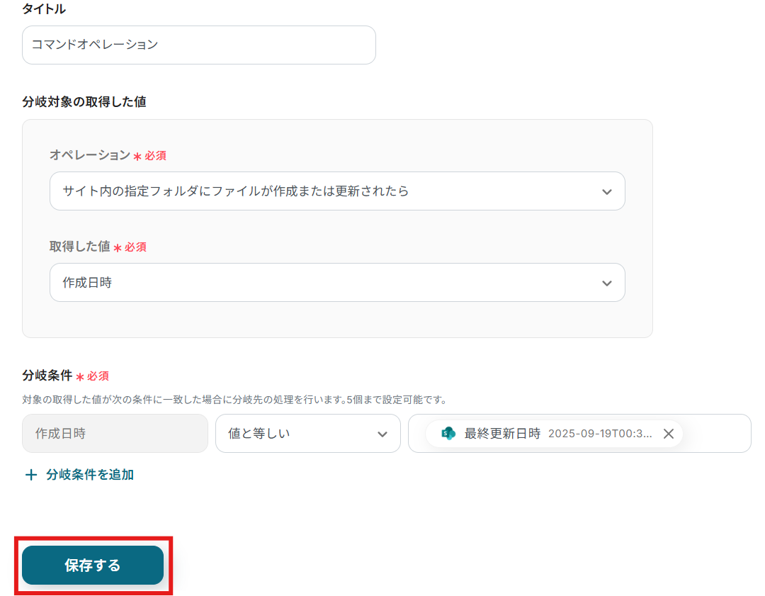 「分岐条件を指定」はデフォルトで設定されています。 「タイトル」は任意で変更可能です。 「分岐対象の取得した値」と「分岐条件」が以下の画像と同じように設定されているか確認してみてくださいね。 今回はMicrosoft SharePointでファイルが作成されたときだけMiroに連携したいので、「分岐条件」が「作成日時」と「最終更新日時」が等しいときに設定されています。 確認できたら「保存する」を選択しましょう。