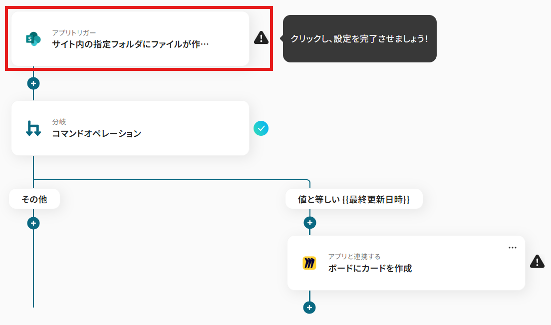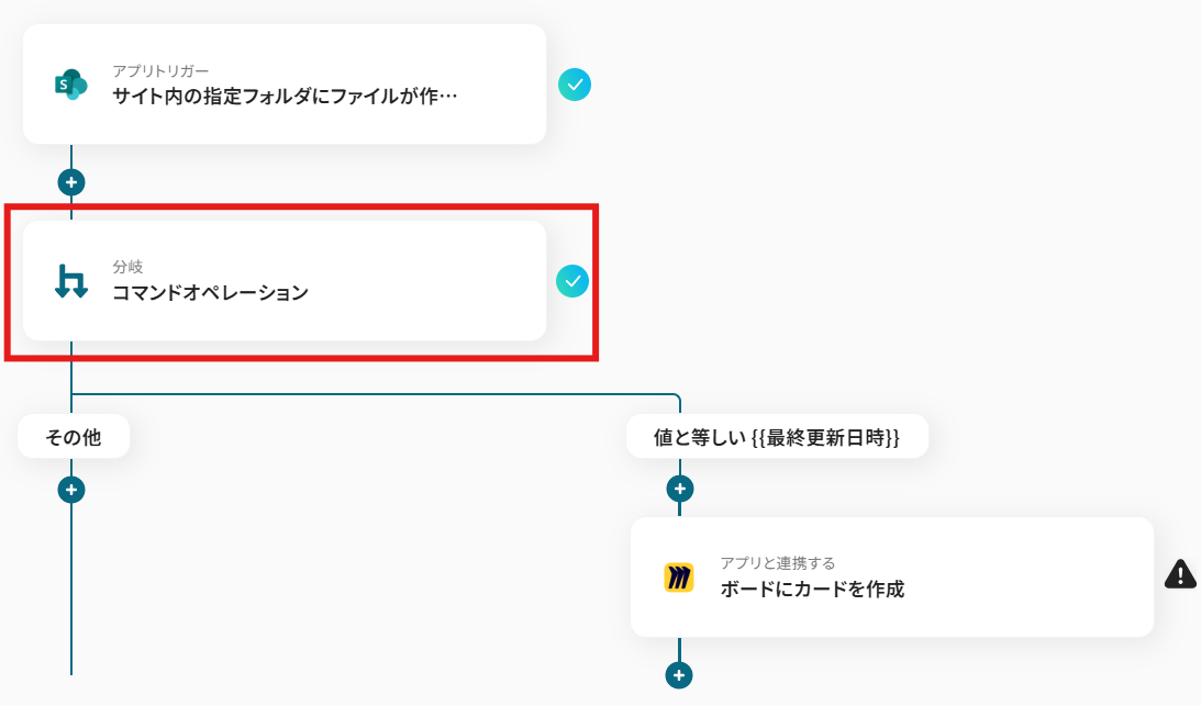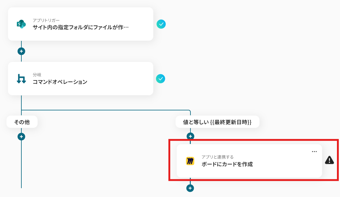 Microsoft SharePointの設定では、通知の対象としたいサイトIDおよびフォルダIDを任意で設定してください。 分岐機能では、ファイルの作成日付と更新日時が一致する際、後続の処理を分岐させる条件を任意に設定できます。 Miroでカードを作成するアクションでは、カードのタイトルや説明文にMicrosoft SharePointのファイル名やURLといった変数を設定したり、固定のテキストを追加したりすることが可能です。 ■注意事項