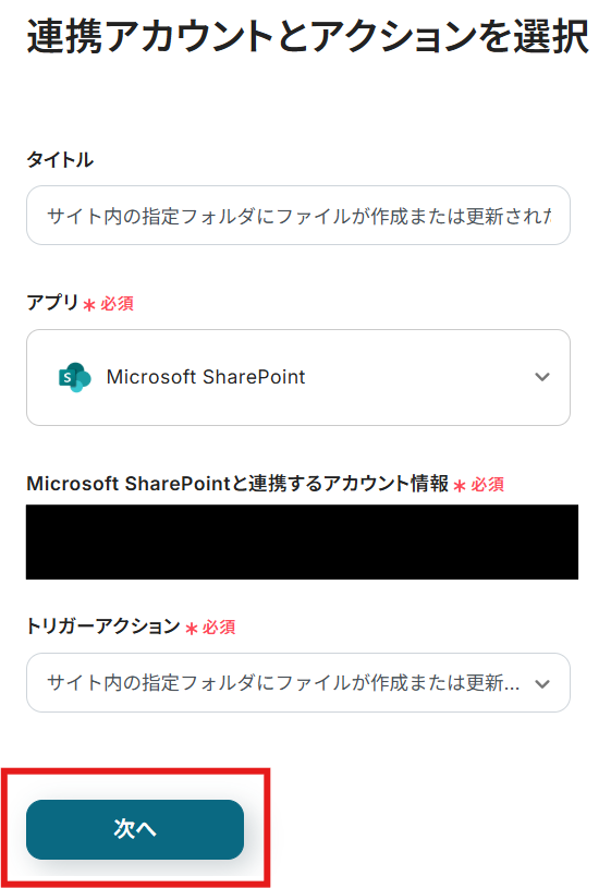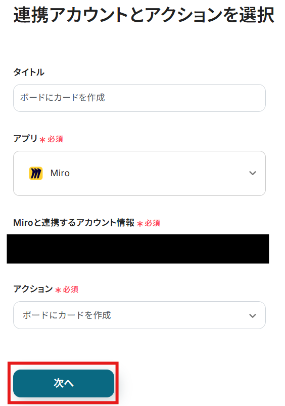 タイトルと連携するアカウント情報を確認し、アクションはテンプレート通りのまま「次へ」をクリックして進んでください。