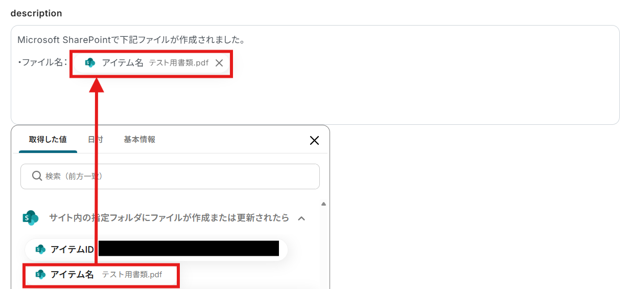 「description」を手動での入力と「取得した値」を使用して以下のように設定しました! 「取得した値」は変数となるため、Microsoft SharePointのサイト内の指定フォルダでファイルが作成される度にそのデータを活用できます!