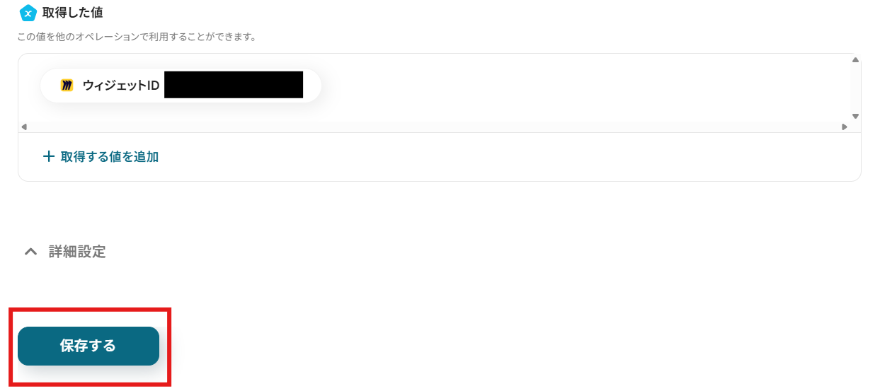 設定できたら「テスト」を行いましょう。 テストに成功すると「取得した値」に反映されます。 詳しくは以下をご覧ください。