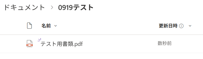 Microsoft SharePointのサイト内の指定フォルダにファイルがない方は、このタイミングで作成しましょう。 今回は例として「0919テスト」というフォルダに「テスト用書類.pdf」を作成しました!