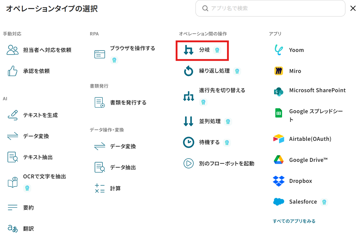以下の画面で「分岐」を選択します。
