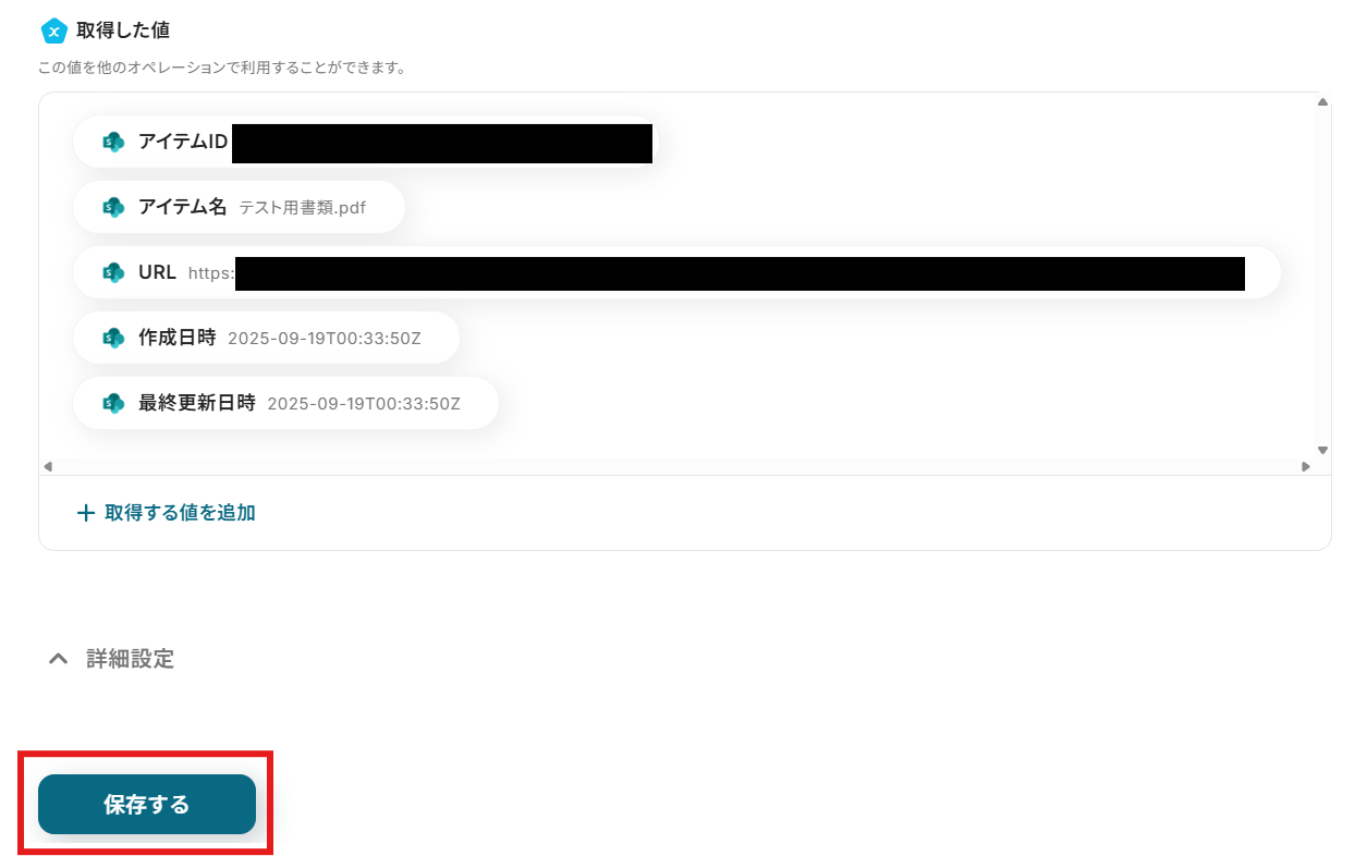 ここでは、Microsoft SharePointでサイト内の指定フォルダに新しく作成されたファイルの情報が反映されています。 「保存する」を選択しましょう。