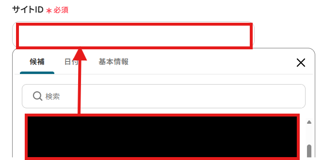 「サイトID」と「フォルダID」を候補から選択しましょう。 候補は、マイアプリ登録したアカウントに紐づいて表示されます。
