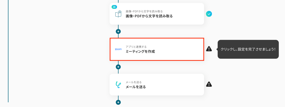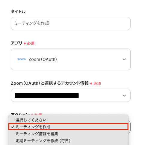 OCRで読み取ったテキストを使って、Zoomでミーティングを作成するための設定をします。 5つ目のオペレーションにある、「ミーティングを作成」をクリックしてください。