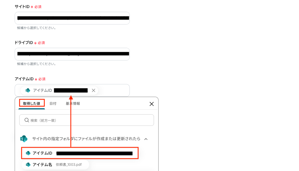 次に、API接続設定 です。 「サイトID」「ドライブID」を候補から選択し、「アイテムID」は取得した値から選択します。
