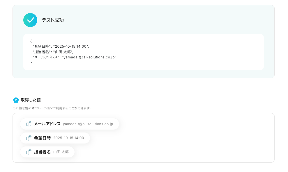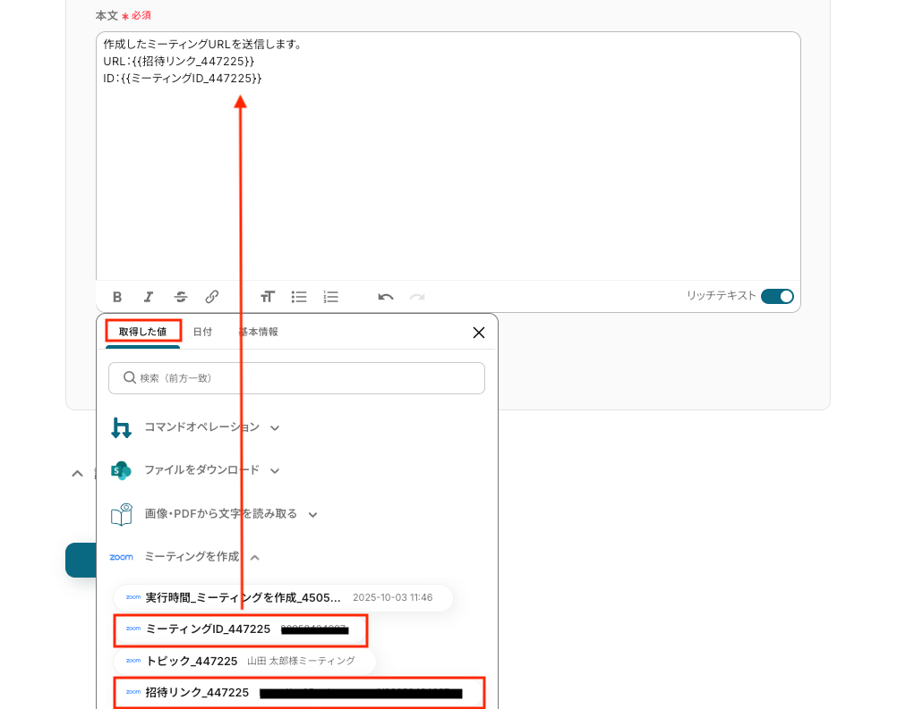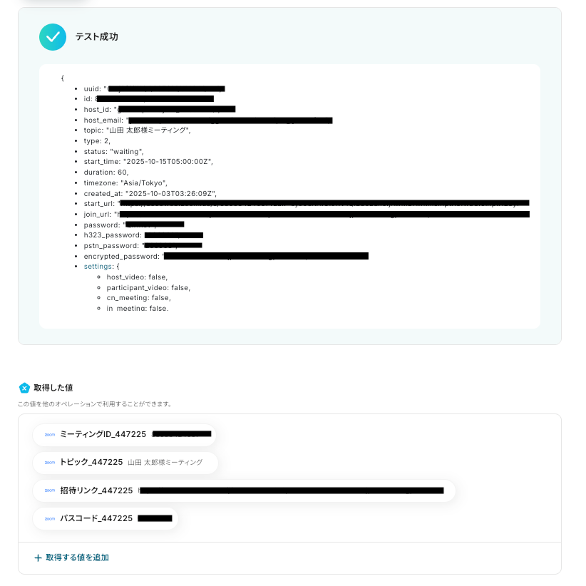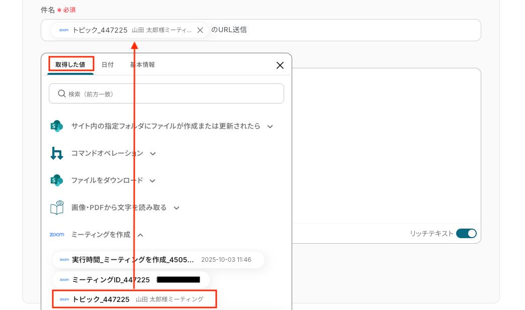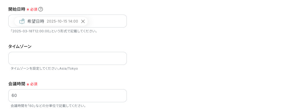 同様に、「開始日時」「会議時間」も取得した値や直接入力により設定してください。