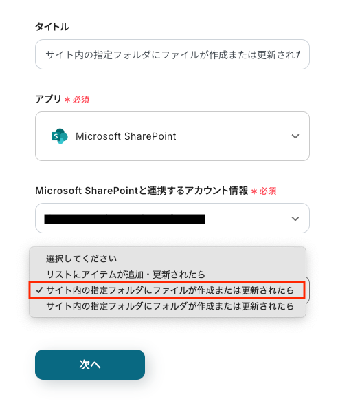トリガーアクション:「サイト内の指定フォルダにファイルが作成または更新されたら」を選択