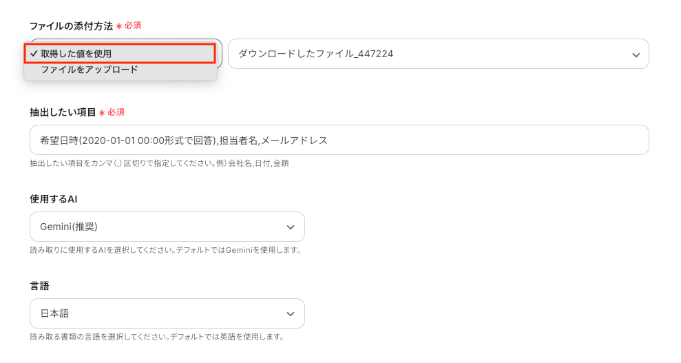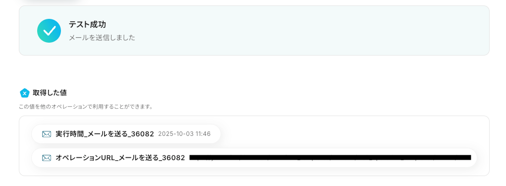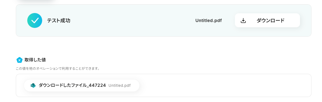 ファイルをアップロード後、テストを行い成功すると、以下のように「取得した値 」が表示されます。 ※「取得した値」は、後のフローで使用します。