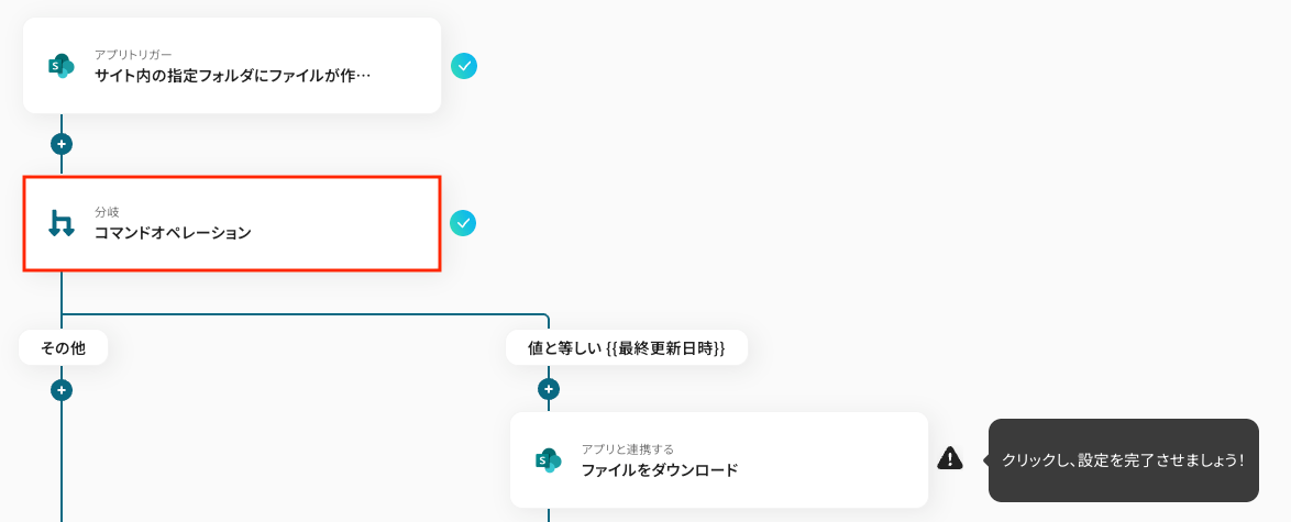 Microsoft SharePointのトリガーをもとに、分岐条件を指定するための設定をします。 二つ目のオペレーションにある、「コマンドオペレーション」をクリックしてください。