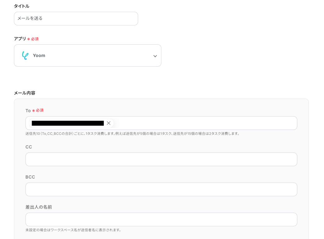 続いて、メールの設定 に進みます。 「タイトル」を確認し、「To」を手動で入力してください。 「To」には、取得した値を設定することもできます。
