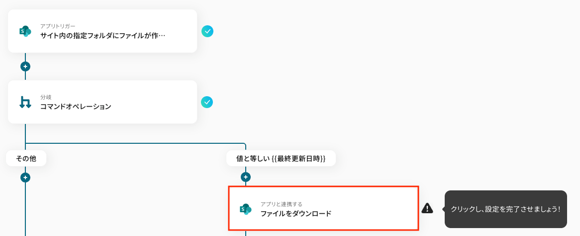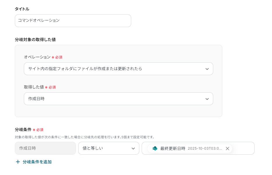 ※作成日時と最終更新日時が等しいかどうかで分岐をさせます。 このようにすることで、等しい場合は新規作成、等しくない場合は更新というルートで切り分けることができます。 なお、取得した値を使用することで、毎回最新のファイル情報が反映されます。