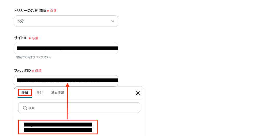 次に、アプリトリガーのAPI接続設定 です。 「トリガーの起動間隔」を確認し、「サイトID」「フォルダID」は候補から選択します。 候補は、マイアプリに登録したアカウントに紐づいて表示されます。