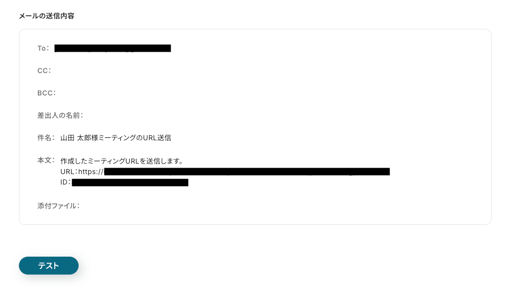 以下を参考に必要項目を設定し、「テスト」をクリックしてください。