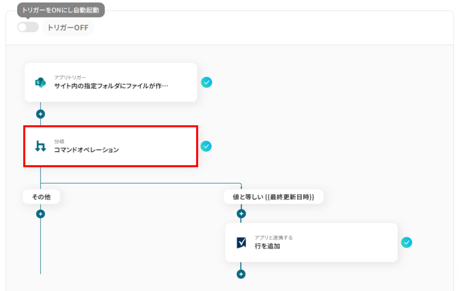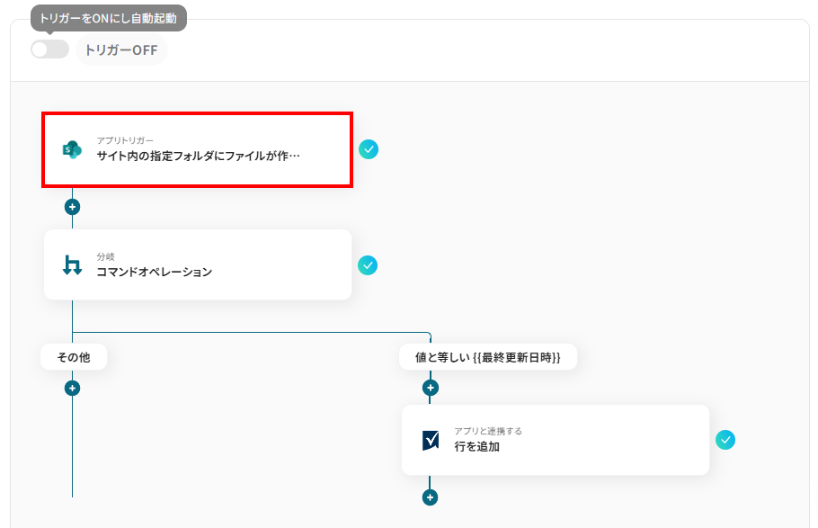 Smartsheetのトリガー設定で、どのシートの行作成を検知するかを任意で設定してください。 Microsoft SharePointのオペレーション設定で、フォルダの作成先となるサイトやライブラリ、またフォルダ名に利用するSmartsheetの情報を任意で設定してください。 ■注意事項