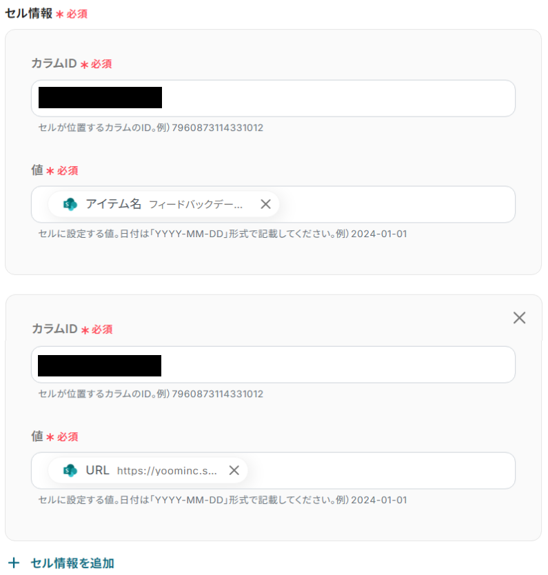 セルに反映させたい情報の数だけ、カムラIDと値を入力しましょう。(ページ最下部の「セル情報を追加」を押せば、入力欄を増やすことができます) 今回は、下記のように反映したい情報を入力しました。
