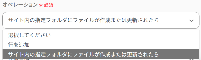 オペレーション:「サイト内の指定フォルダが作成または更新されたら」がデフォルトで設定されています。 プルダウンより「行を追加」を選ぶこともできるので、お好みで変更してください。