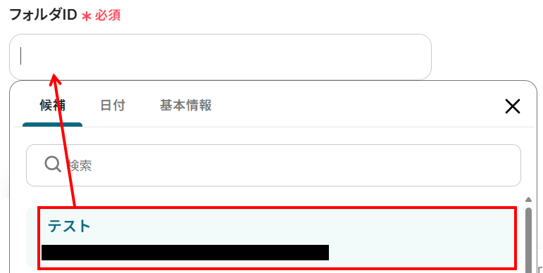 フォルダID:こちらも入力欄をクリックし候補から対象のフォルダ名を選択しましょう。