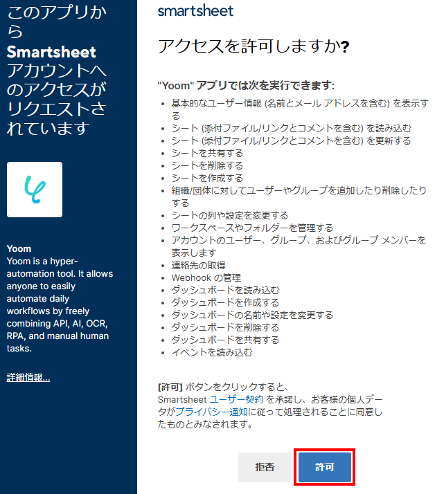 Smartsheetの準備ができたら、Yoom画面に戻りましょう。 下記を参考にそれぞれの項目を入力してください。