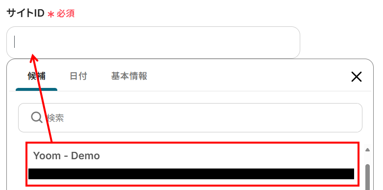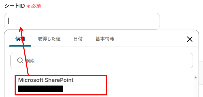 サイトID:入力欄をクリックすると下記のような候補が表示されます。 先ほど作成したMicrosoft SharePointのサイトIDを選択してください。