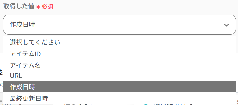 取得した値:こちらもプルダウンから選択可能です。 分岐の対象にしたい項目を選択してください。