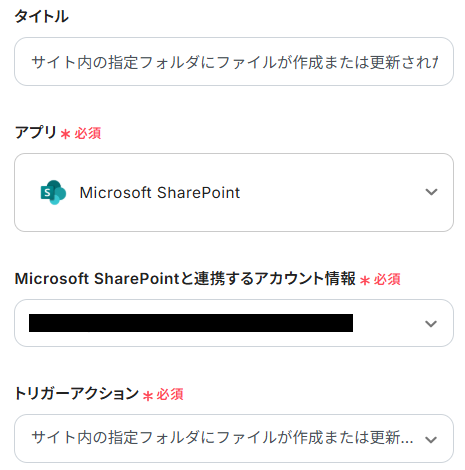 タイトルとアカウント情報はステップ1で設定した内容が入力されています。 なお、タイトルは任意で分かりやすい名前に変更可能です。 アクションは、テンプレート通りに「サイト内の指定フォルダにファイルが作成または更新されたら」のままで大丈夫です。 入力が完了したら、「次へ」を押して進みましょう。