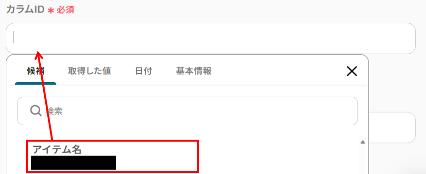 カラムID:こちらも入力欄をクリックし、候補からデータを反映させたいカラムを選んでください。