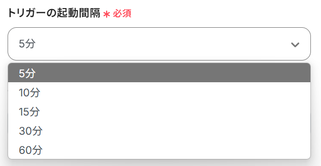 トリガーの起動間隔:トリガーの起動タイミングは、5分、10分、15分、30分、60分のいずれかで設定できます。 ご利用プラン によって、設定できるトリガーの最短間隔が違うので、その点は要チェックです。 なお、基本的にはそのプランの最短の起動間隔にしてお使いいただくことをおすすめします。