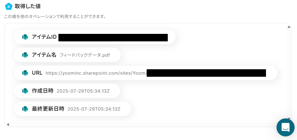 入力が完了したら、「テスト」を実行してみましょう。 成功すると、下記のようなアウトプットが表示されます。 Microsoft SharePointに保存したファイル内容がアウトプットとして反映していればOKです!