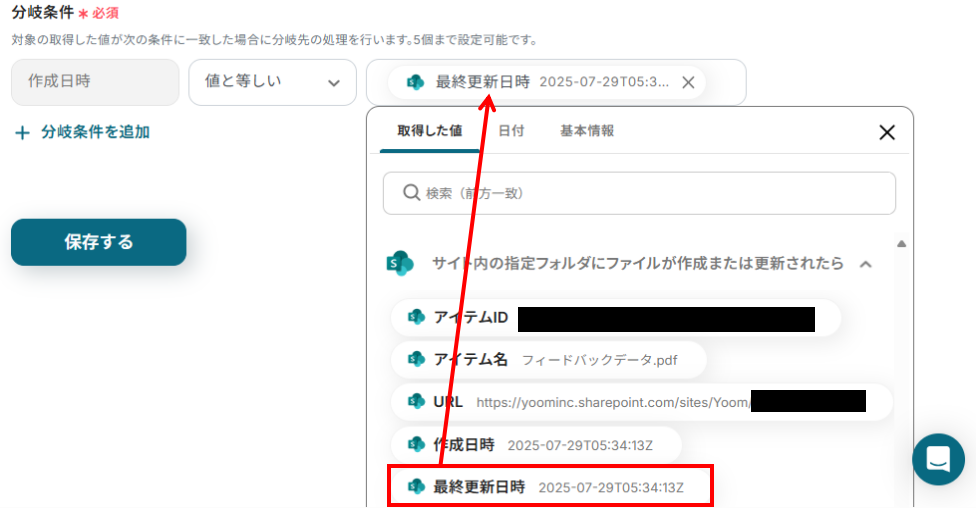 分岐条件:下記のように入力欄をクリックすると、アウトプットが表示されるので条件としたい項目を選択しましょう。 このように設定することで、Microsoft SharePointに入力した「作成日時」とMicrosoft SharePointで実際に情報を更新した「最終更新日時」が同じ値だった場合のみ、分岐しフローを進めることができます。