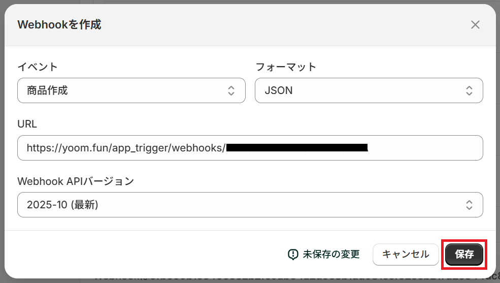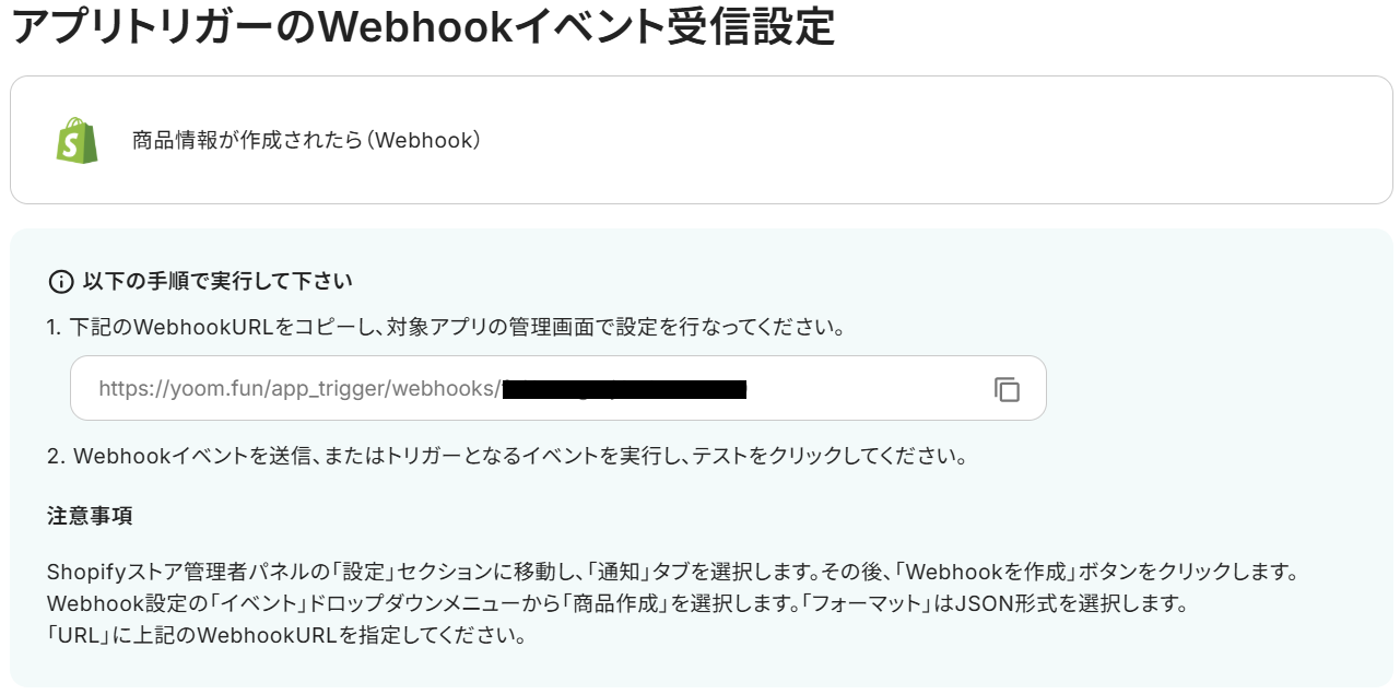 まず「注意事項」を参考に、ShopifyでWebhook設定を行いましょう。