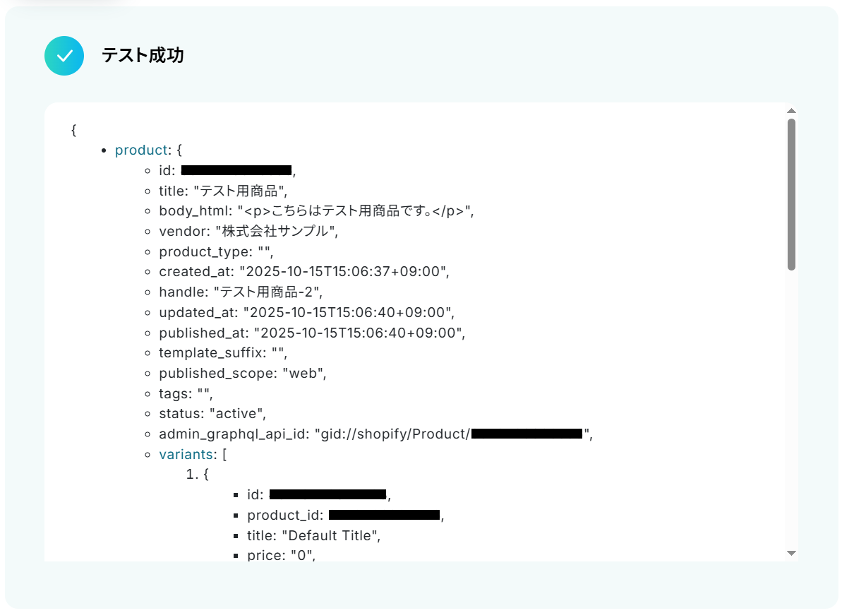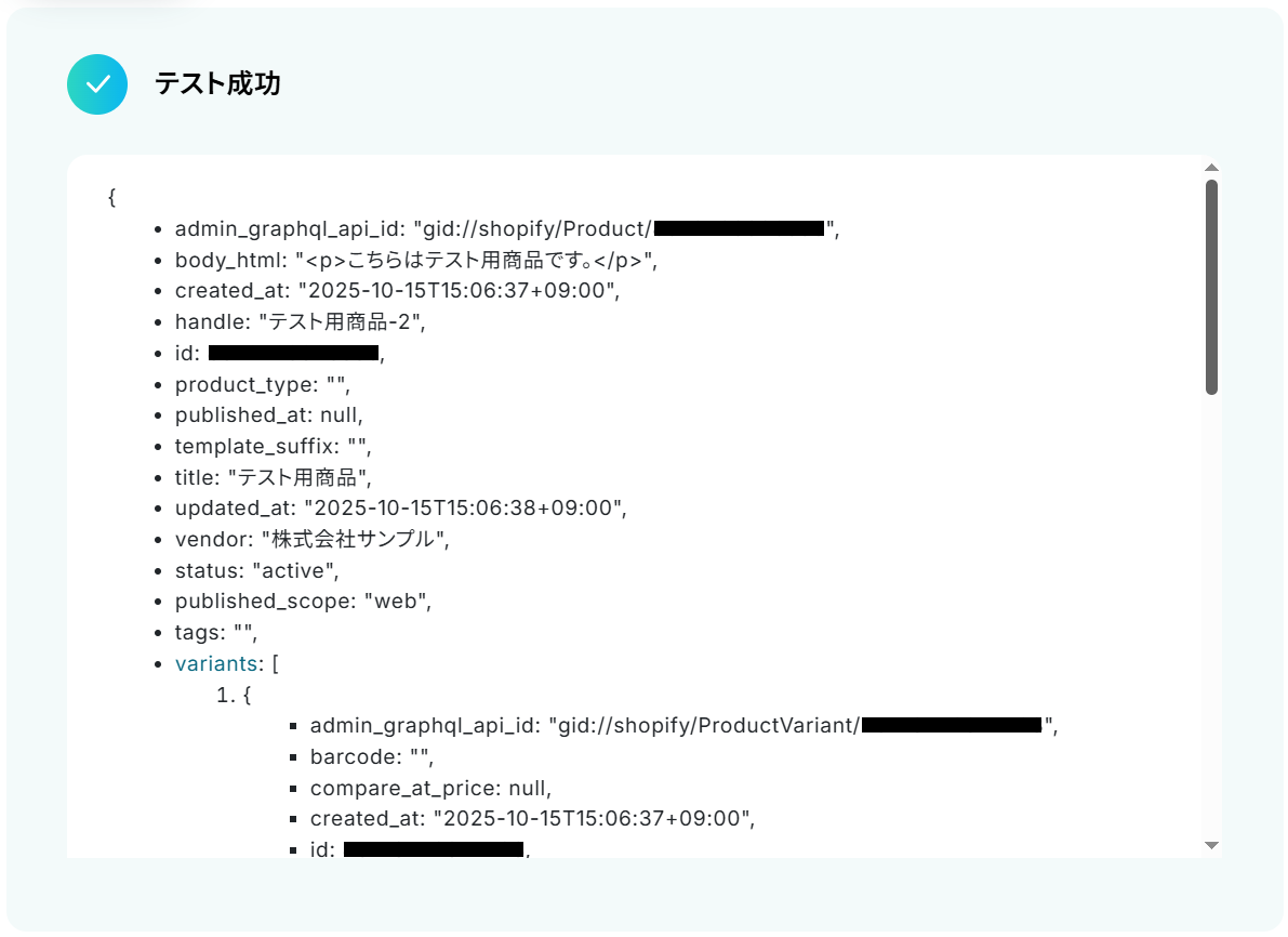 このワークフローでは、Shopifyで商品情報が作成されたら、Slackに通知することが可能です。これにより、チーム全体が最新の商品情報をリアルタイムで共有でき、円滑な対応やマーケティング活動が可能になります。