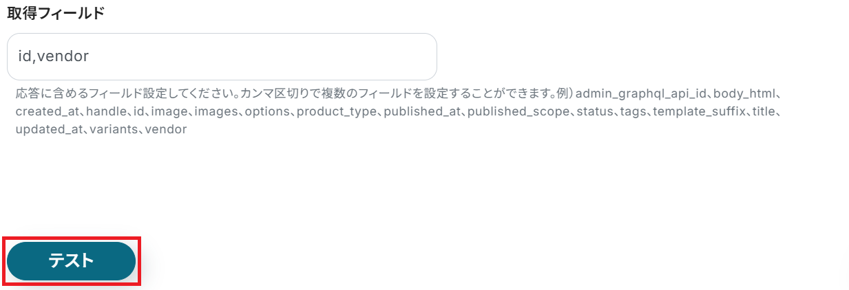 テキストボックス下部の例にある、任意の取得フィールドをカンマ区切りで入力してテストしましょう。