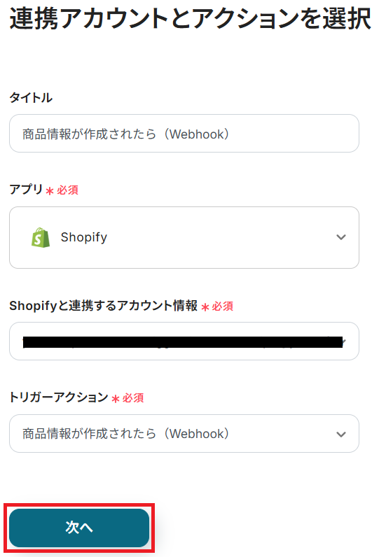 タイトルと連携するアカウント情報を任意で設定し、トリガーアクションはテンプレート通りに「商品情報が作成されたら(Webhook)」のまま「次へ」をクリックします。